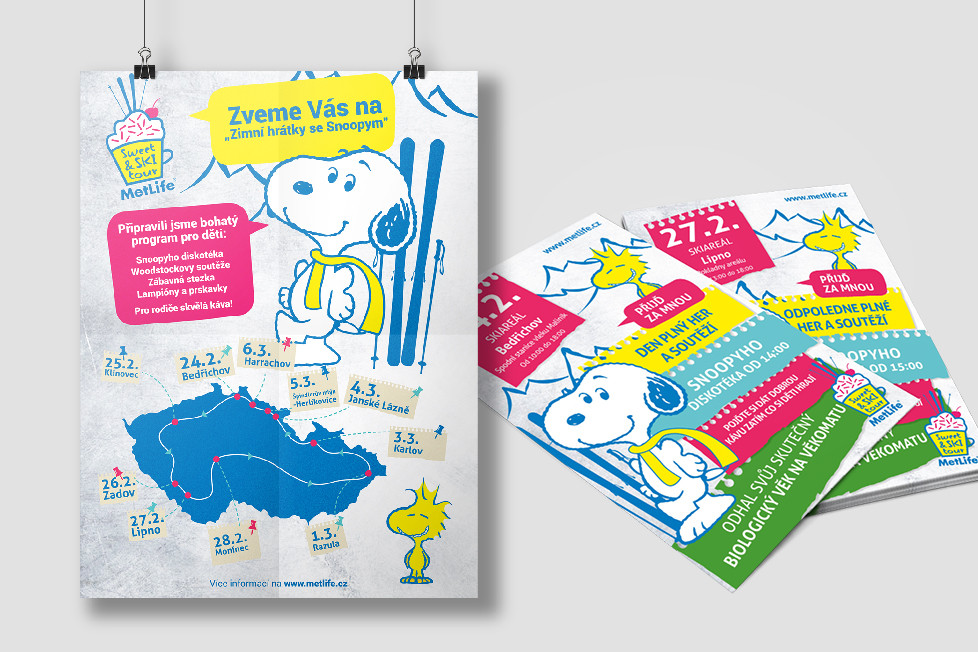 S naším kamarádem Snoopym jsme si padli do oka. Pro MetLife pojišťovnu jsme vytvořili kompletní branding jejich zimní tour Sweet and Ski Metlife tour. Celkem jsme brandovali nafukovací stan, lehátka, sedací pytle, kelímky na kávu, zimní bundy, čepice, polep dodávky... Vytvořili jsme plakáty, letáky a to všechno v jednotném vizuálním stylu, za použití nového loga Sweet and Ski. Už teď se těšíme na další ročník...